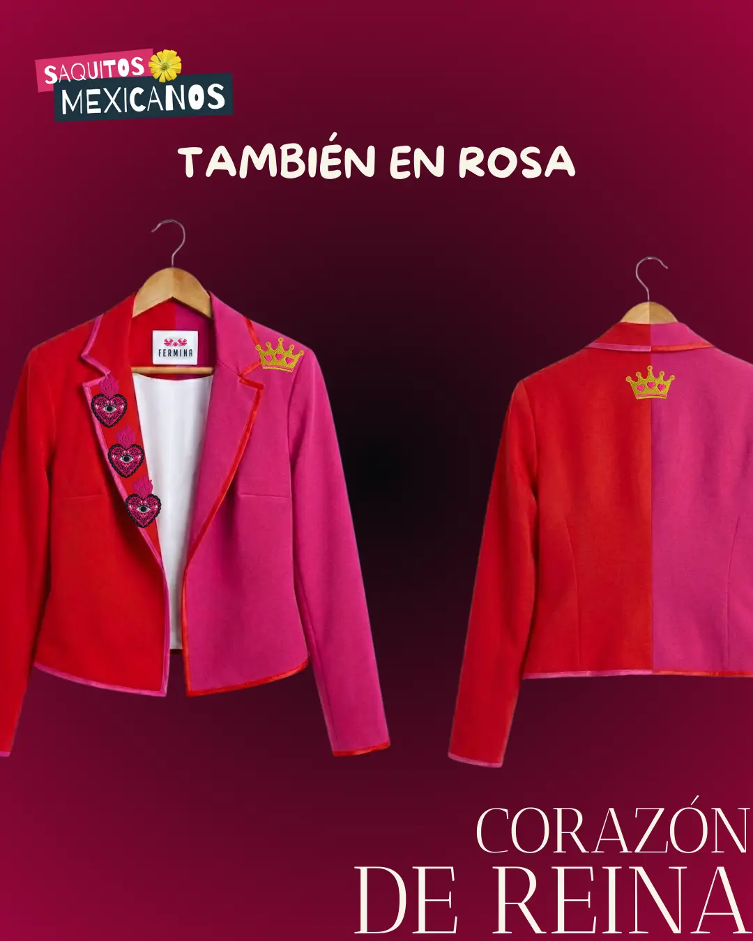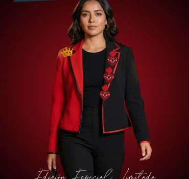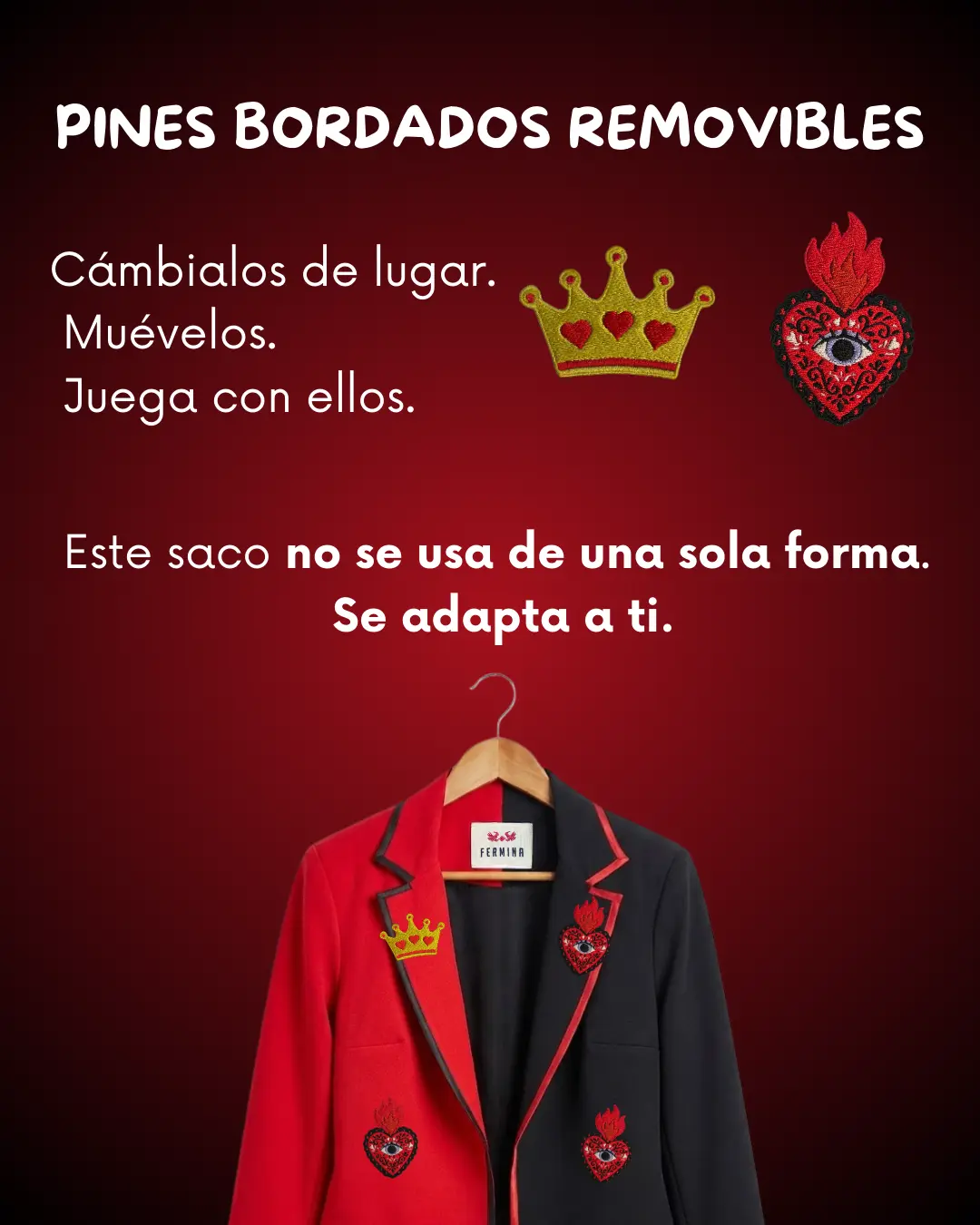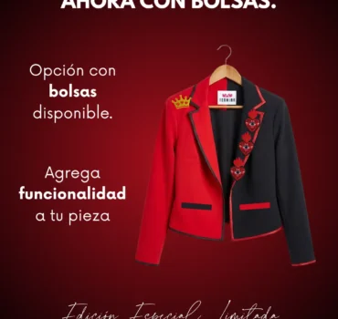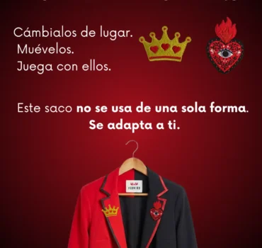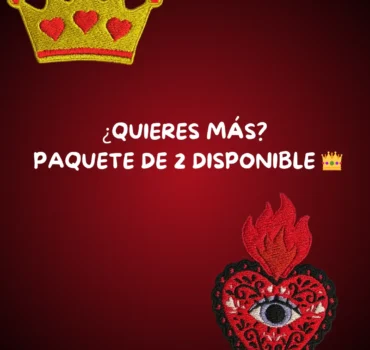 Este diseño incluye pines bordados removibles, inspirados en milagritos mexicanos y la corona de la reina: