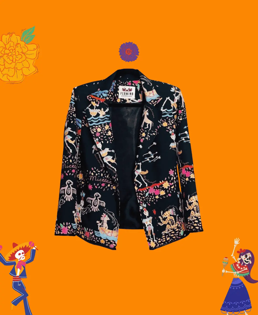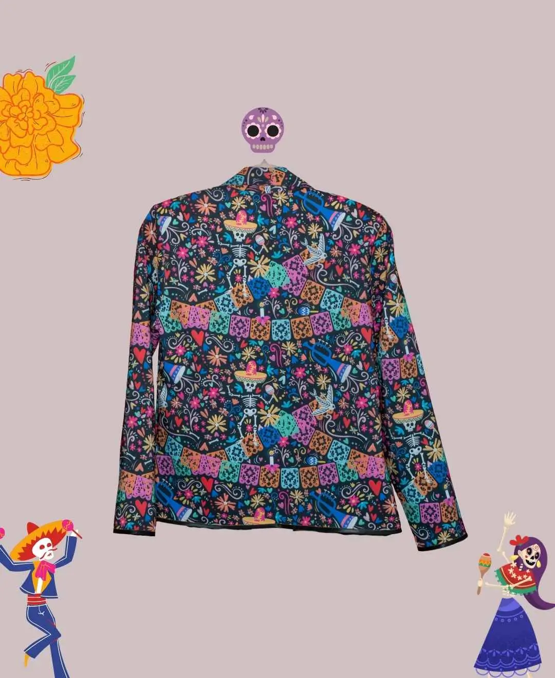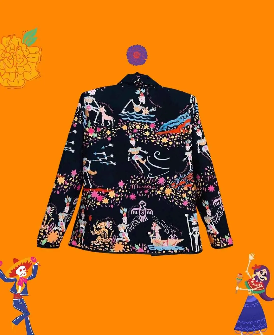•Para los mexicas, existía cuatro lugares a donde una persona podía llegar después de haber fallecido, y esto dependía de las causas de la muerte: el Alma de un guerrero muerto en combate o en sacrificio llegaría a Tonatiuhichan. Si uno moría ahogado o en relación con el agua, su destino era Tlalocan. Si una mujer fallecía en labor de parto, entonces pasaría a Cincalco. Y para todos aquellos que morian de diferentes formas incluyendo la muerte natural, viajaban por el MICTLAN Diseño realizado en pintura Guache para después plasmarlo en este bello saco de arte. Composición de poliéster con técnica de sublimado. Cuenta con forro interior completo. Incluye Hombreras.
