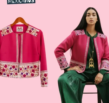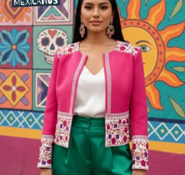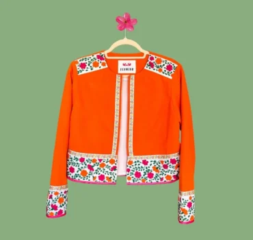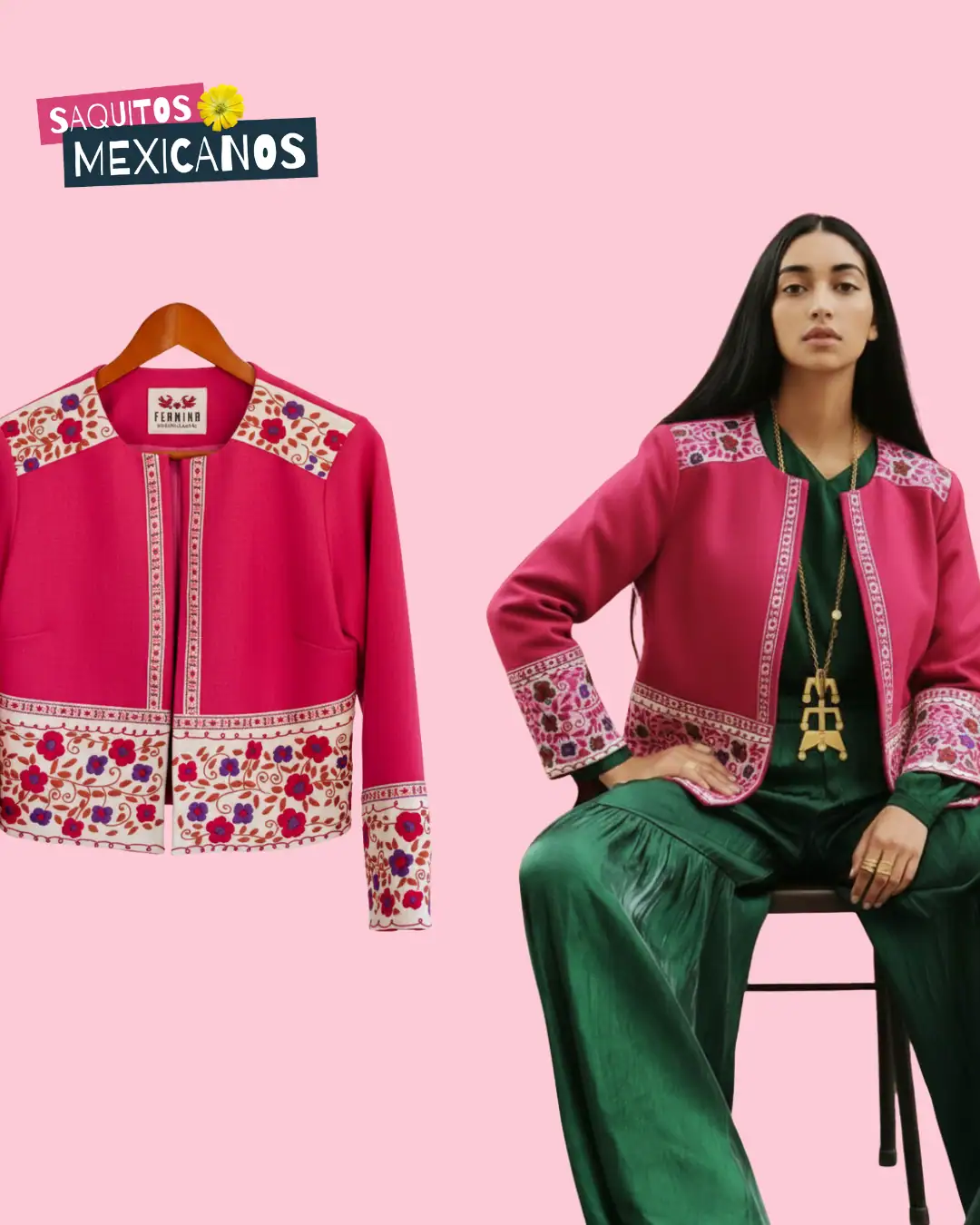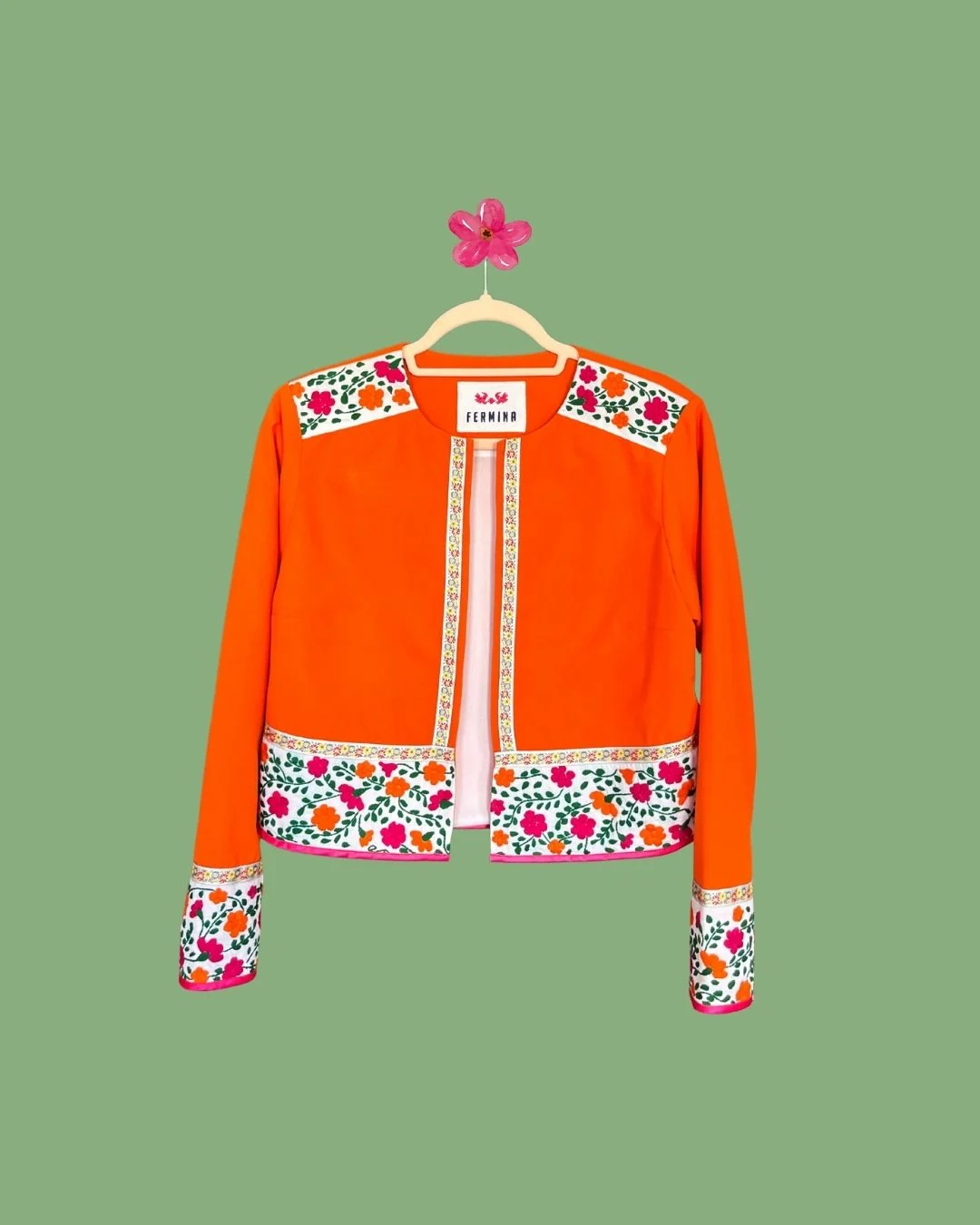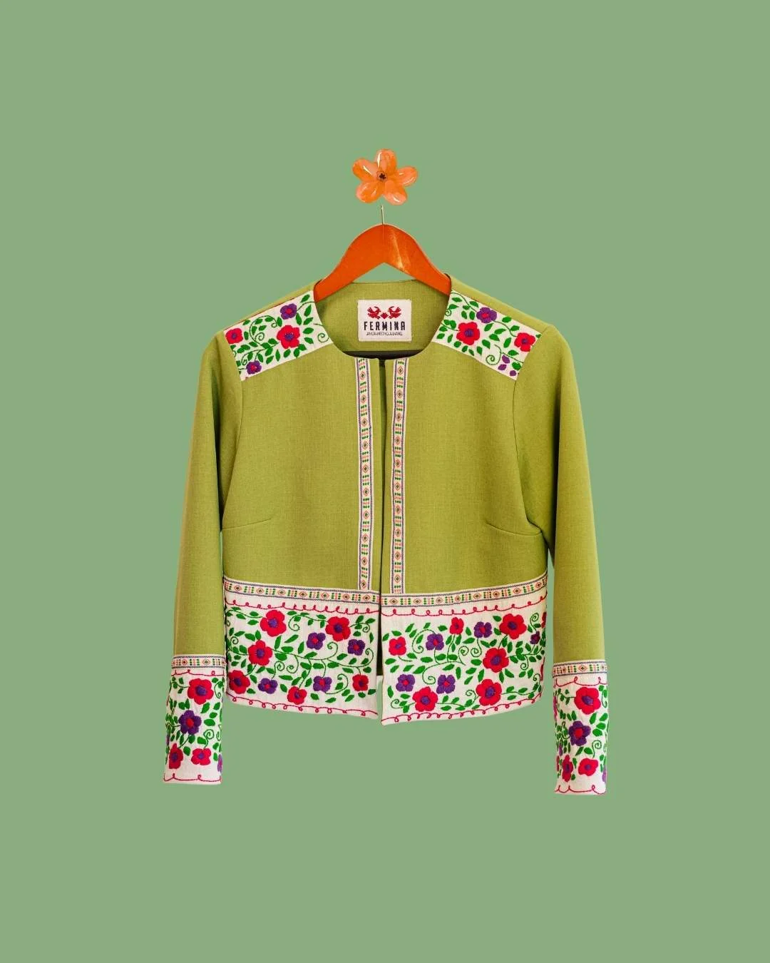 Nohemí lleno de color y folclor. Un saquito con detalles bordados a mano, realizados en la comunidad de San Mateo Tlacoxcalco, en colaboración con la artesana Nohemi Hernández.